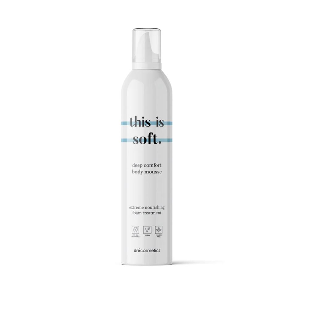 “this is soft.” body mousse is een uniek diepvoedend verzorgingsproduct voor de huid. Het rijke, romige schuim geeft een instant gehydrateerd gevoel. Dankzij de toegevoegde zemelenproteïnen heeft dit product een extra verzachtende werking op de gevoelige en geïrriteerde huid. Bovendien heeft deze body mousse in de zomer een extra troef want door de intens voedende eigenschappen heeft dit product ook een bruinverlengende werking. “this is soft.” body mousse smeert heel gemakkelijk uit en wordt snel opgenomen. Na het aanbrengen heb je geen last van een plakkerig gevoel en geniet je van het comfort van een intens gevoede en verzorgde huid. Het schuim heeft een heerlijk frisse geur op basis van tuberoos, jasmijn en zwarte bessen. Dit product bevat geen minerale oliën en is parabenen- en siliconenvrij. “this is soft.” body mousse is dermatologisch getest en geschikt voor de gevoelige huid.
